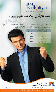 Allied Bank introduces a new and easy concept of investment for you, just deposit as low as Rs. 25,000 for a year and get monthly, quarterly, half yearly or yearly profit on maturity, or even get profit in advance.
